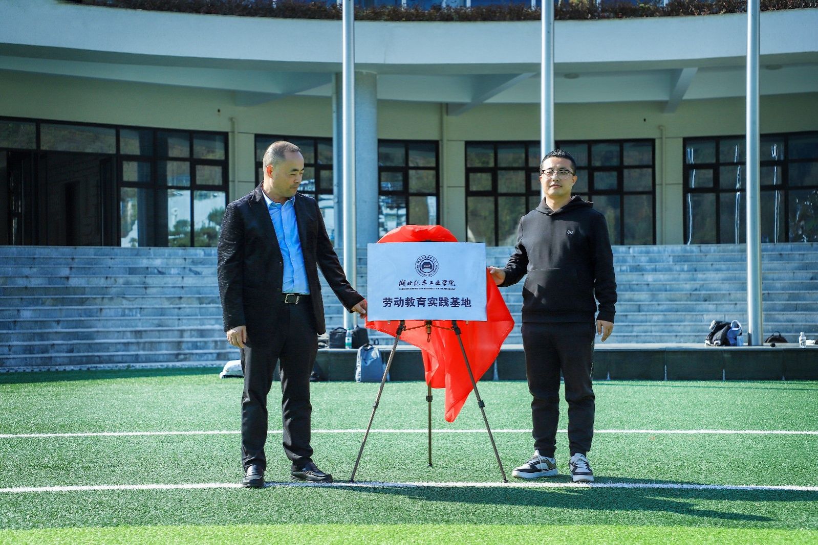校团委副书记焦建杰与实践基地负责人王成兵共同为湖北汽车工业学院劳动教育实践基地揭牌。